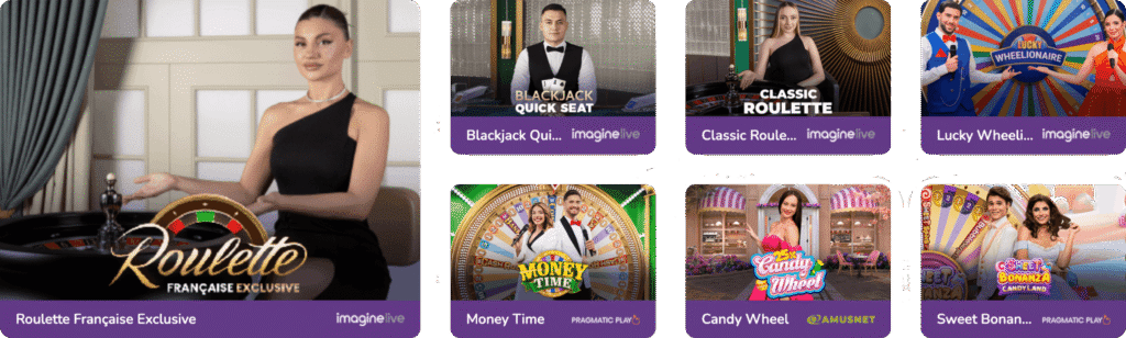 Game Shows Interactifs : Crazy Time (roue fortune avec 4 jeux bonus immersifs), Monopoly Live (basé jeu société légendaire), Deal or No Deal Live (adaptation émission télévisée), Dream Catcher (roue fortune simple), Mega Ball (fusion bingo et loterie).
